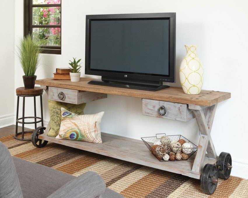 Существуют разные способы изготовления подставок под телевизор в зависимости от выбранного материала и дизайна, поэтому в работе они могут отличаться друг от друга. Рассмотрим, как можно сделать данную конструкцию своими руками.