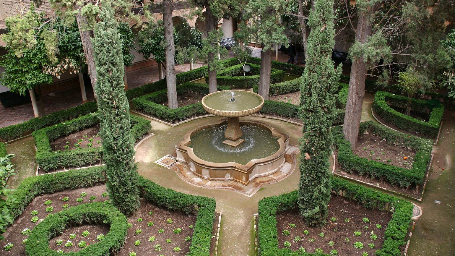 Часто вместо газонов создают просторные мощёные площадки со сложным узором из цветной плитки или камня. В оформлении бассейна, беседок, других сооружений применяют мрамор, мозаику.