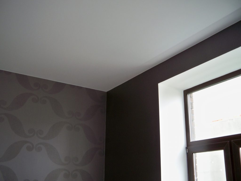 Обратите внимание, как выглядит стык с натянутым полотном. Если стены ровные, и линия соприкосновения не требует маскировки, наклеивайте плоский багет или элемент с широкой стеновой частью. Иногда в подобных ситуациях просто располагают молдинг под натянутым полотном