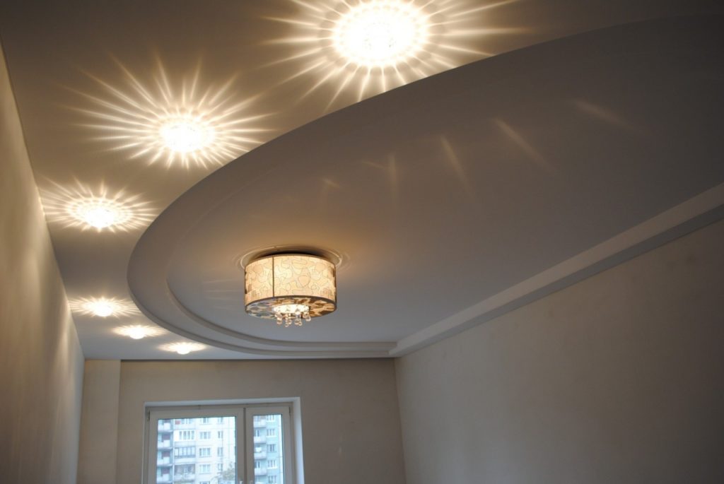 нет возможности использовать точечные светильники большой мощности, поэтому, прежде чем установить потолок, нужно тщательно продумать, как расположить световые приборы.