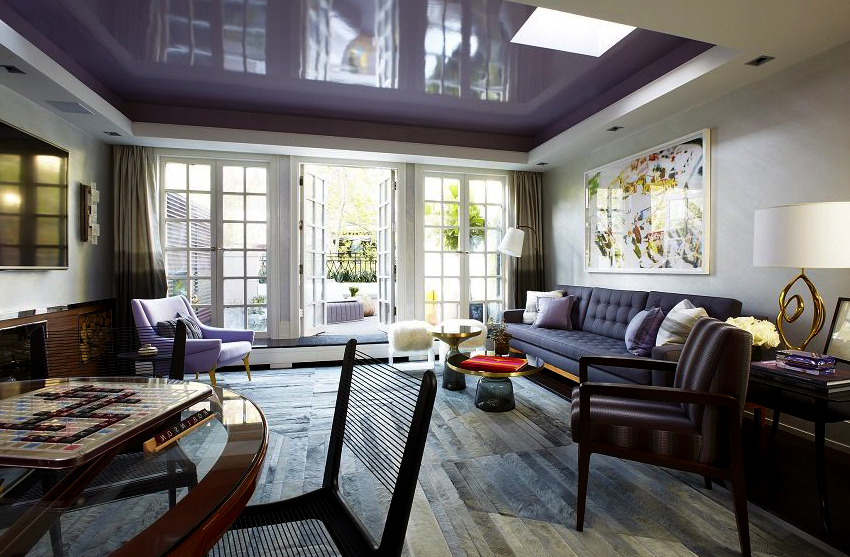 Помимо классических светлых глянцевых потолков очень эффектно смотрятся такие же зеркальные цветные вставки. Гостиная – не спальня и не детская, так что тут можно дать волю фантазии.