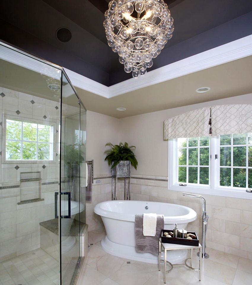 Темные цвета могут быть использованы для декорирования потолка в ванной