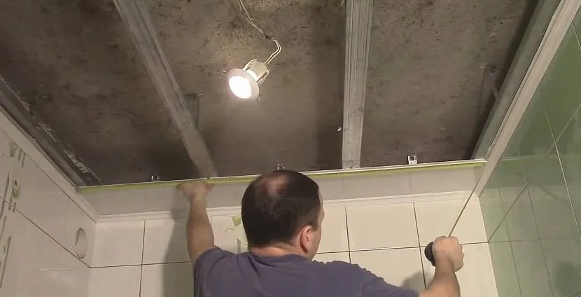 - В самом низком углу от базового потолка отмеряем высоту межпотолочного пространства.