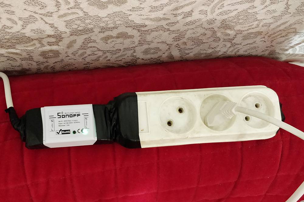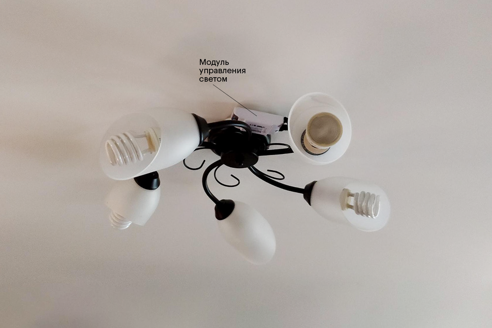 Реле, установленное на потолке в моей квартире. Выглядит не очень, но другого варианта установки не было из-за конструкции люстры и натяжных потолков  Для детской я придумал такой способ установки — чтобы не присоединять датчик к люстре, решил сделать из модуля Sonoff вайфай-розетку и к ней подключить ночник
