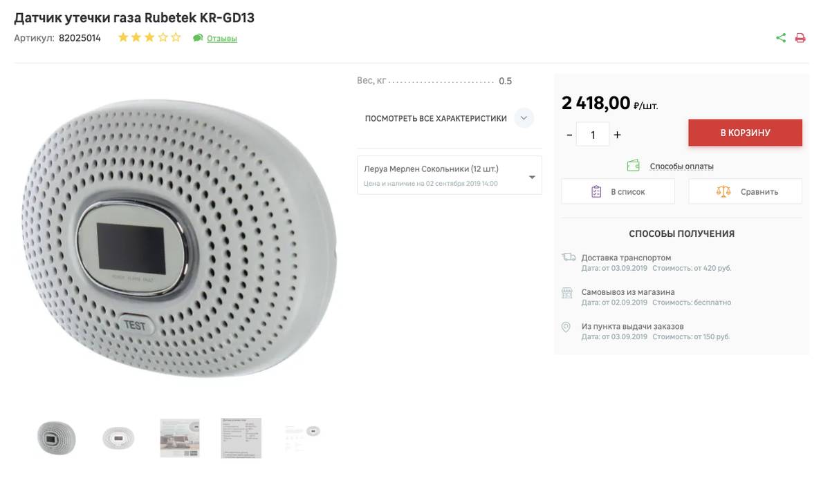 К сожалению, в комплекте нет датчика газа, его пришлось докупать отдельно. Я решил не ждать посылки из Китая и приглядел в «Леруа Мерлен» подходящий гаджет.
