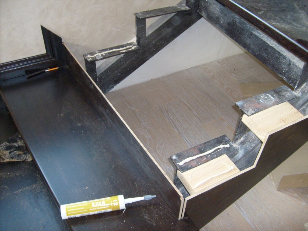 Облицевать металлический каркас можно не только деревом, хотя это самый распространенный вариант. Если сначала прикрепить к нему проступи и подступенки из толстой фанеры, то на неё можно уложить ламинат, ковролин, другие напольные покрытия.