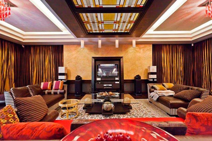 Внутренние помещения представлены несколькими спальнями, утончённой столовой, кабинетами для работы и специальным залом для игры в настольный теннис. В интерьере четко прослеживается желание хозяев глядеть богато. Все покрыто позолотой. На стенах висят произведения популярных мастеров кисти.