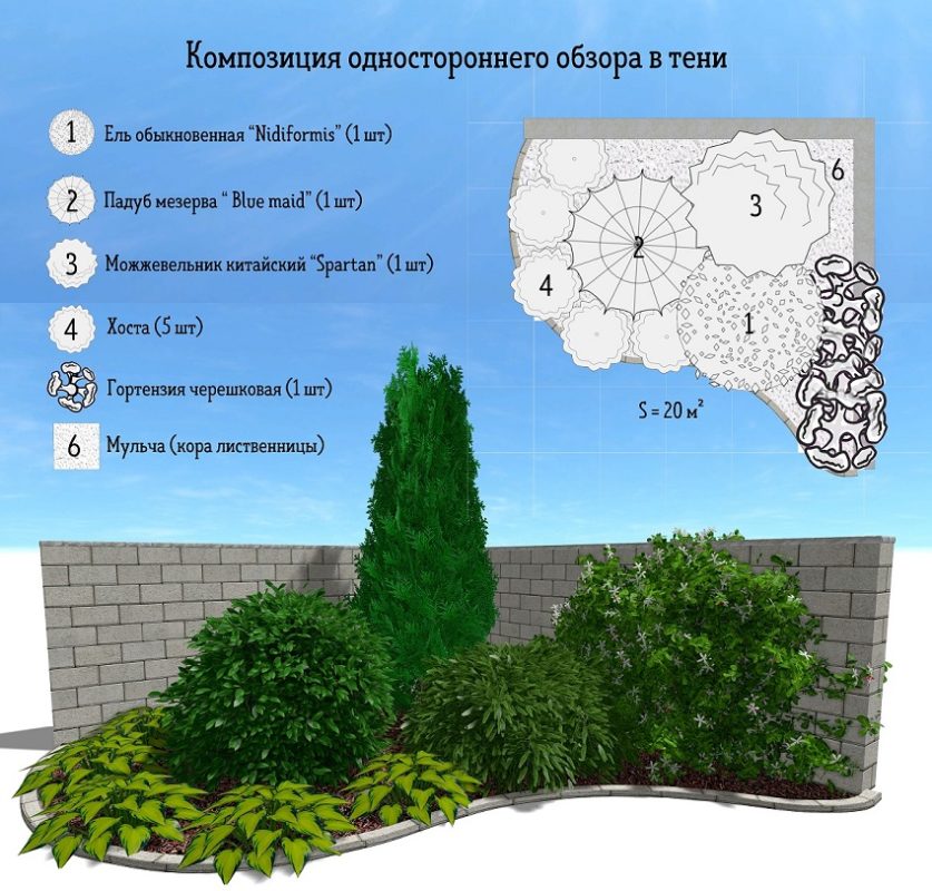 Можно сделать акцент на одном крупном растении, скульптуре, фонтане и вокруг них высадить кустарники и многолетники. Преобладают правильные геометрические формы.
