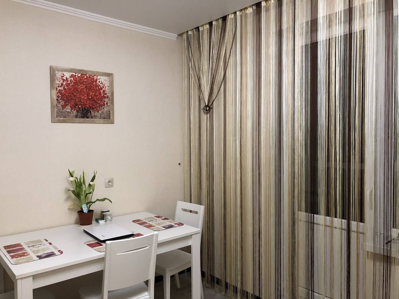 На кухне очень часто используются нитяные шторы в качестве двери. Если квартира является студией, т.е. кухня объединена с комнатой, то в этом случае кисея может выступить элементом, который визуально разделяет помещение на две зоны.