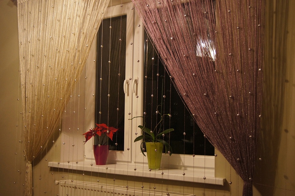 На окнах такие занавеси используются гораздо реже. Многие боятся экспериментировать, предпочитая более консервативные варианты в интерьере.На окнах оригинально будут выглядеть короткие шторы. При желании всегда можно укоротить нитяные шторы. Интересно использование металлических нитей, или с металлическими бусами.