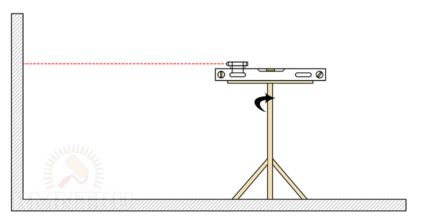Вкрутите в подставку шуруп так, чтобы шляпка совпала с линией выхода лазерного луча. Затем включите указку и наведите ее на стену. В точке, на которую будет показывать лазер, вверните еще один саморез, а затем на него и тот, который ввернут на планке перед указкой, нужно положить тонкую рейку. На нее после устанавливают еще один нивелир.