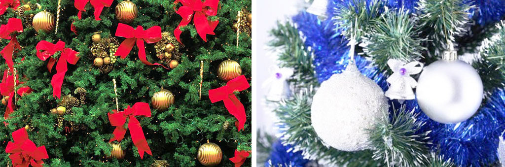 Дизайнеры, понятное дело, никак не проходят мимо украшенной елочки. Но вот со стилистикой тут полная неразбериха. Явно один и тот же стиль обзывают каждый по-своему, или точно разные – одним и тем же именем. Тем не менее, что-то общее все-таки находится; особенно – для небольших искусственных елок на коническом основании. Они очень густы, поэтому украшают их в стиле минимализма: 3-4 вида игрушек примерно одного размера. Украшений каноны стиля не касаются, они могут быть сколь угодно вычурными. В елочном минимализме прослеживаются 2 тенденции: «теплая», на рис. слева, и «холодная», там же справа. Выбор той или иной определяется общим стилем оформления помещения; наконец, просто вкусом хозяина или заказчика.