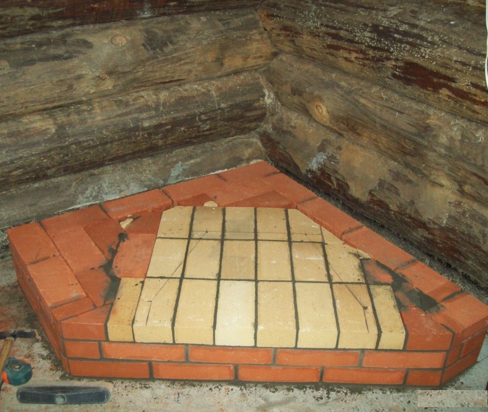 Вначале идет разметка места, где будет устанавливаться основа под печь — фундамент. При этом нужно учитывать, что дымоходная труба при проходе через чердачное перекрытие должна проходить на расстоянии не менее, чем 120-150 мм от деревянных балок. На деревянных полах намечают контуры фундамента, выпиливая часть досок.Чтобы точно определить место, где будут выпилены доски полов под устройство фундамента, применяется отвес, который закрепляется на потолке, на нужном расстоянии от балки перекрытия. После того, как отвес остановится, на полу делается отметка, одного из углов печи. Так же, точками, отмечаются остальные угловые ее части, а затем полученный план выверяется строительным уровнем и уголком. Далее, следует вычертить на полу форму будущего фундамента (как уже говорилось, он должен быть шире печного основания). По полученной разметке будет производиться выпиливание досок пола – так, чтобы дойти до грунта. В грунте подпольев роют яму нужных габаритов, глубина должна быть не менее 50 сантиметров от поверхности земли. Фундамент может быть обустроен из бутового камня или кирпича. Если основа будет обустраиваться из бутового камня, то установка опалубки в котловане не требуется. Достаточно укладывать очищенный от грязи камень слоями, каждый из которых заливается бетонным раствором (каждый слой где-то на 1/4-1/3 пространства ямы)