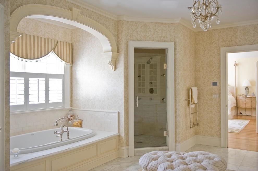 Узор дамасск, выполненный в нейтральных тонах – на фото в интерьере ванной комнаты