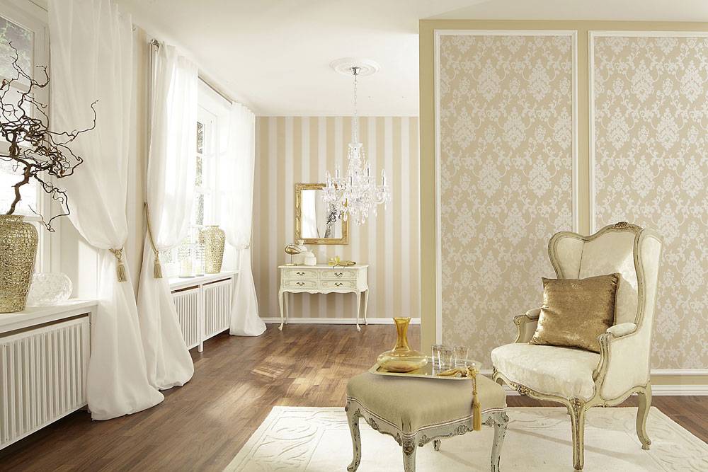 Очень интересно будут смотреться обои, имеющие золотистые или серебристые переливы с глянцевой поверхностью. В этом случае дополнительное декорирование обеспечивается за счет оформления подходящими рейками или молдингами. С их помощью можно сделать необходимый акцент на поверхности стен. Этот декор будет смотреться очень оригинально и интересно. Обои дамаск от бренда Sirpi: