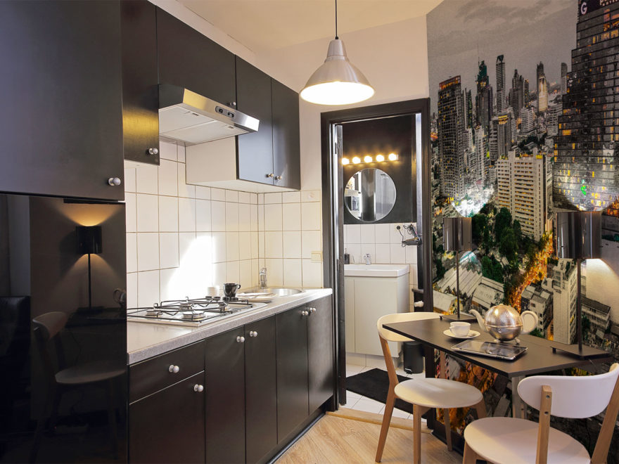 - Визуально расширить пространство помогут зеркала, глянцевые поверхности, установка дополнительных светильников над обеденным и рабочим столами.