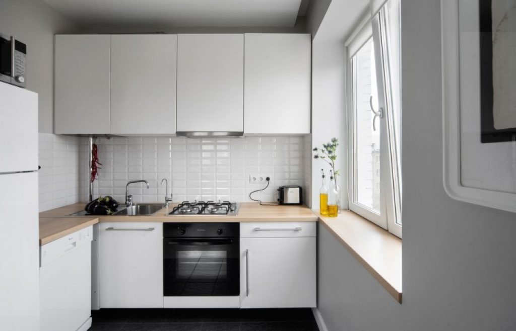 Такой вариант оформления интерьера выглядит очень нарядно, легко и просторно, но белая мебель и отделочные материалы потребуют немало внимания: в маленькой кухне будут ясно видны даже малейшие пятнышки. Если вы не готовы педантично наводить чистоту, используйте более практичные цвета.