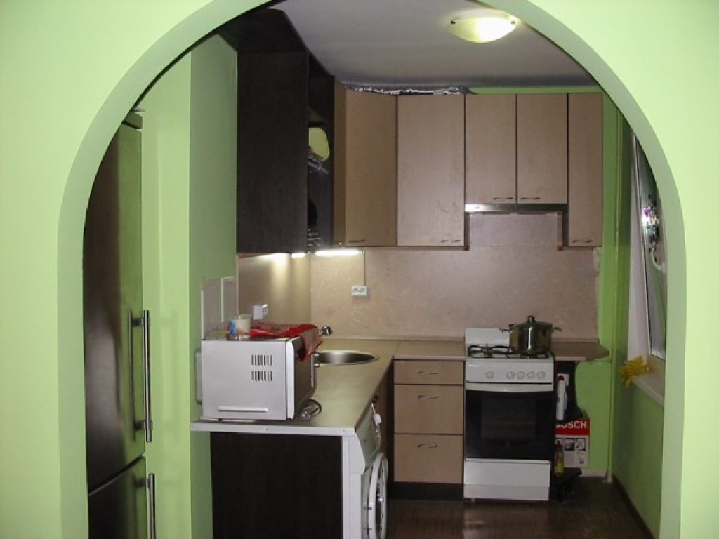 Обустройство кухни в хрущевке с газовой плитой требует наличие двери. Но занимающую много места распашную можно заменить раздвижной или складной.В крохотной кухне без газа от двери можно отказаться вообще — это добавит простора помещению. Проем можно оформить в виде арки или оставить свободные дверные откосы.