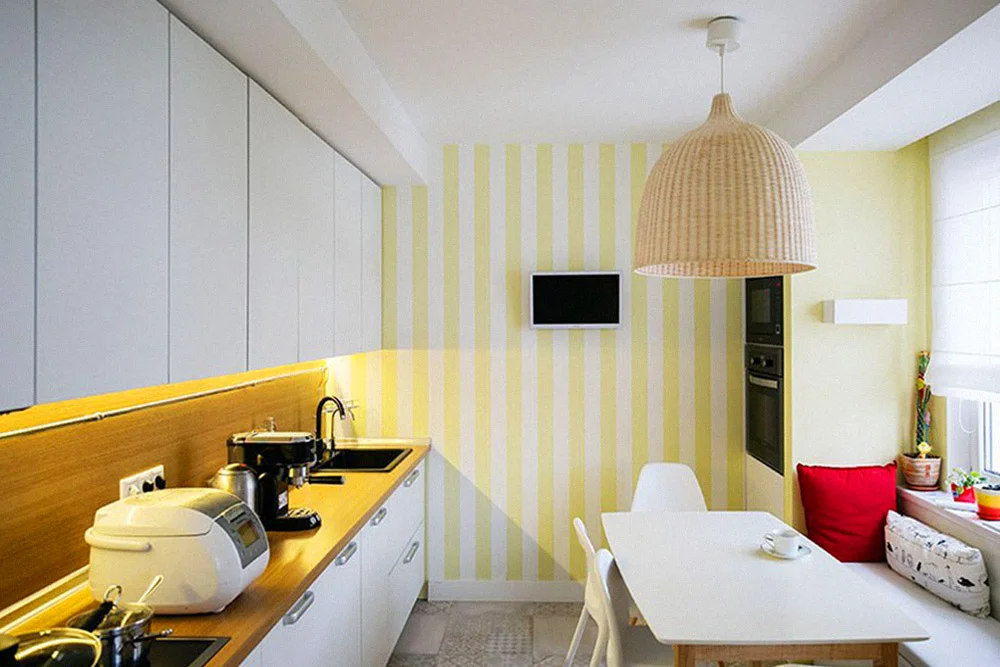Оптические иллюзии на стенах нивелируют некоторые проблемы. Визуально поднять потолок поможет вертикальная полоска, увеличить пространство узкой комнаты — горизонтальная. Обои с мелким рисунком расширяют кухню, крупный рисунок наоборот — поэтому подойдет для оформления только части стены.