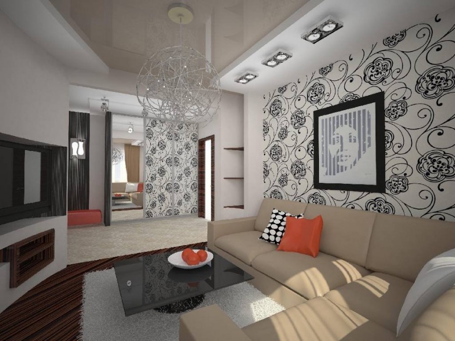 Зал может быть отделан как одним типом обоев, так и разными материалами. В условиях маленького помещения подойдут оба варианта. В интерьере гостиной можно сочетать разные узоры и цвета, выделяя некоторые области с помощью фотообоев или зонировать пространство.