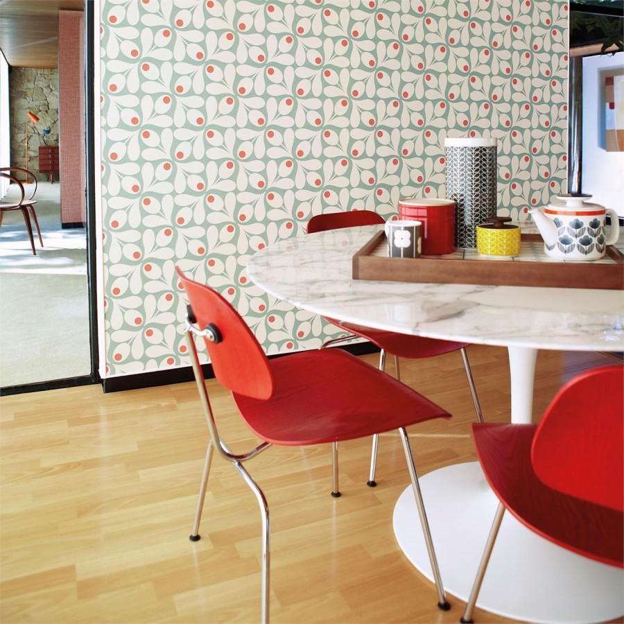 Обои для кухни, фото которых размещаются в модных каталогах-2022, обязательно включают коллекции с рисунком. В тренде изображения фруктов, цветов, растений, зелени. Они выглядят романтично и отлично подходят к кухонной тематике.