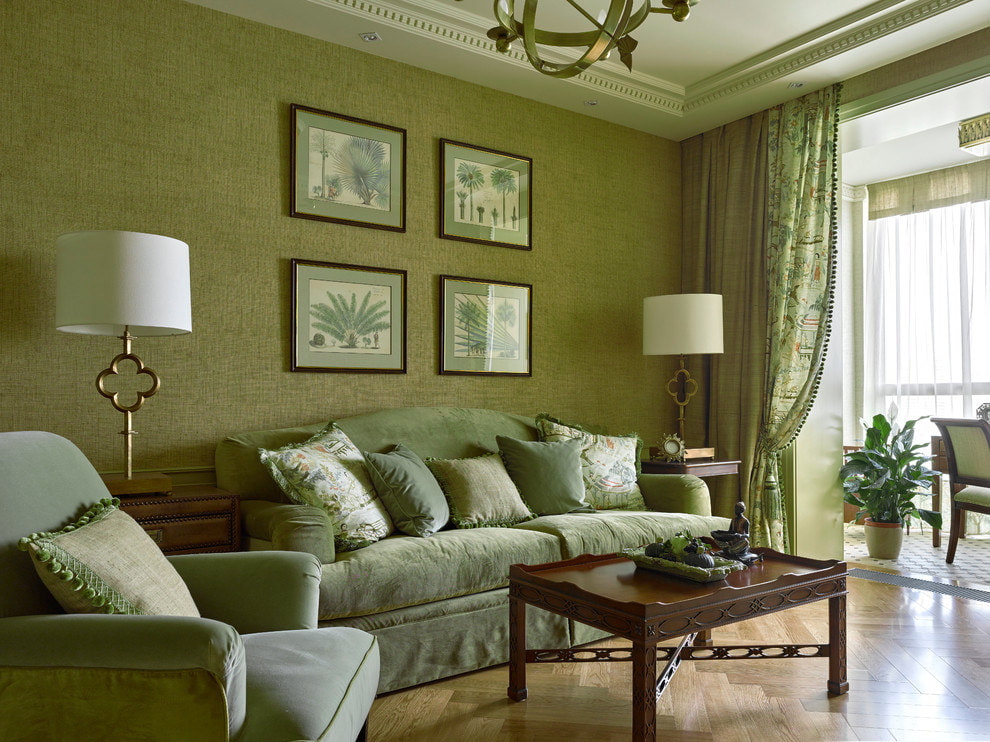 Оливковый цвет в интерьере гостиной наиболее выигрышный вариант. Основной тон остается в приглушенной гамме и передает невозмутимость элегантного классического стиля.