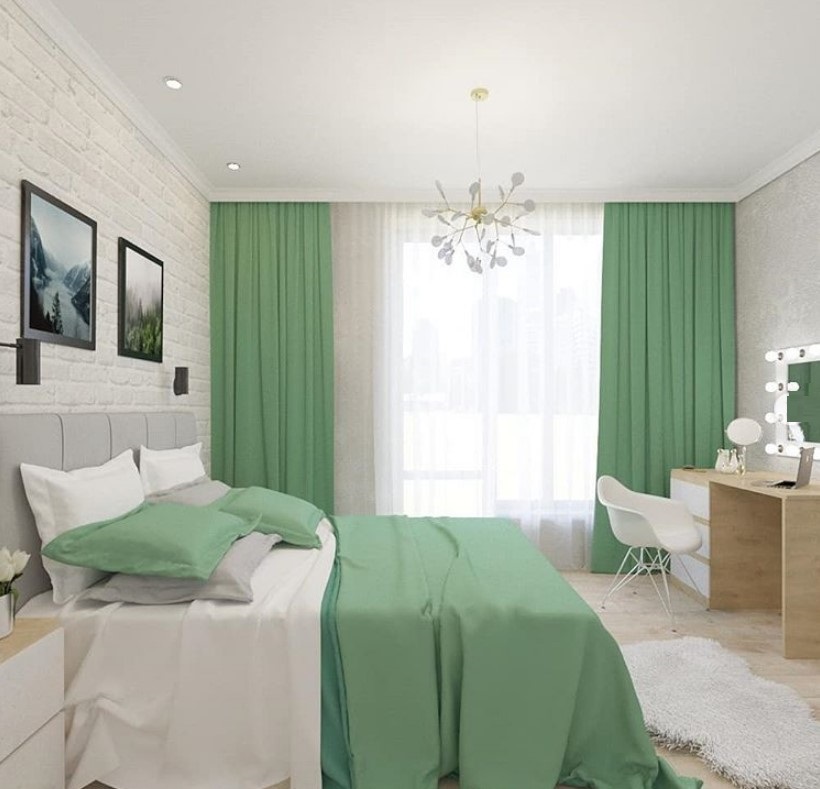 - Под красный кирпич + светло-оливковый. Вариант неожиданный, но во многих специализированных журналов можно увидеть примеры спальни именно с такими стенами, причем, смотрится это довольно уютно.