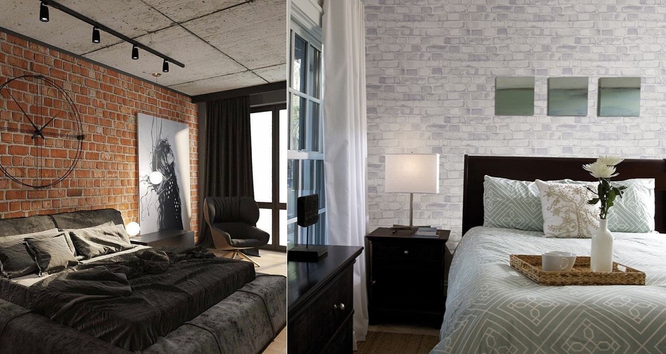 Обои под кирпич в спальне