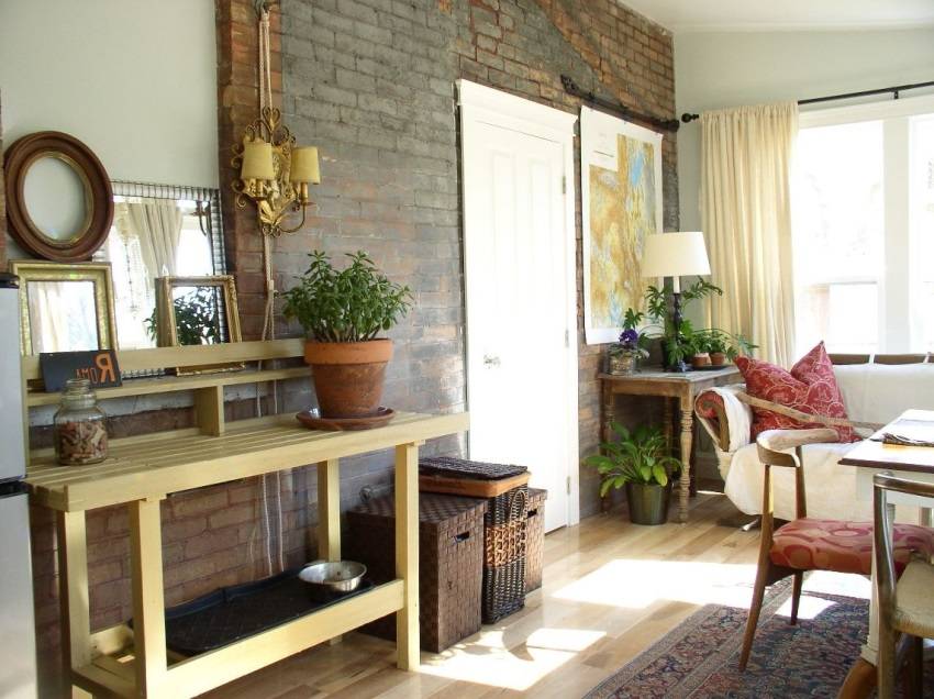 Оформление кирпичной стены в интерьере гостиной, прихожей и спальни