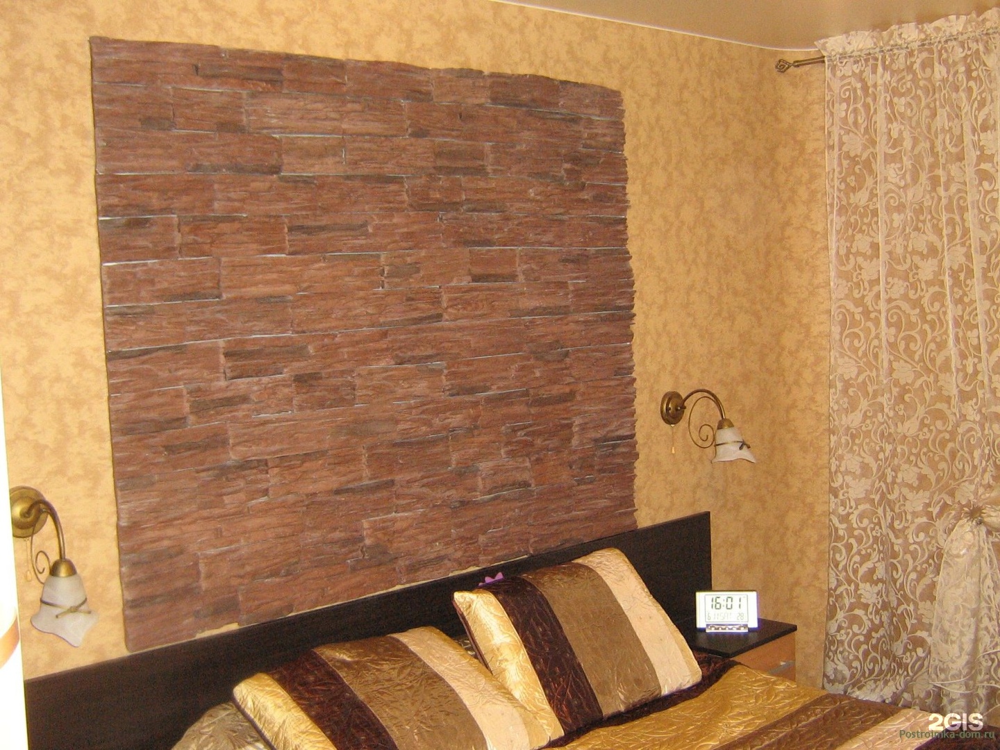 - Обои под камень в спальне станут креативной ноткой. Ими можно выделить, например, изголовье кровати.
