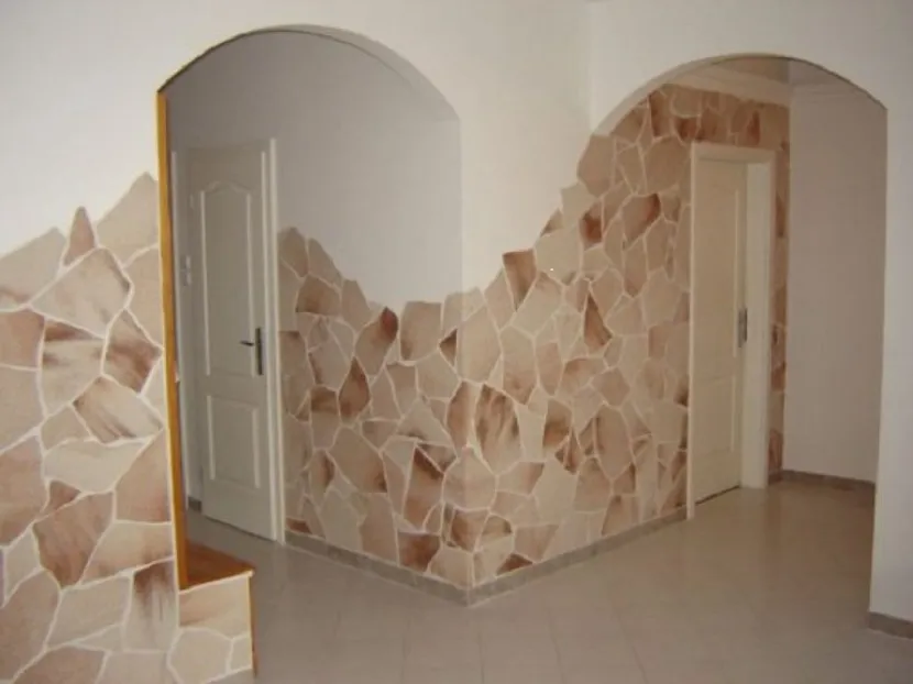 Отделка прихожей декоративным камнем этой категории схожа с оклеиванием обоями. Единственное условие – нанесение клея только на стену, материал при этом остаётся чистым. Порядок действий следующий: