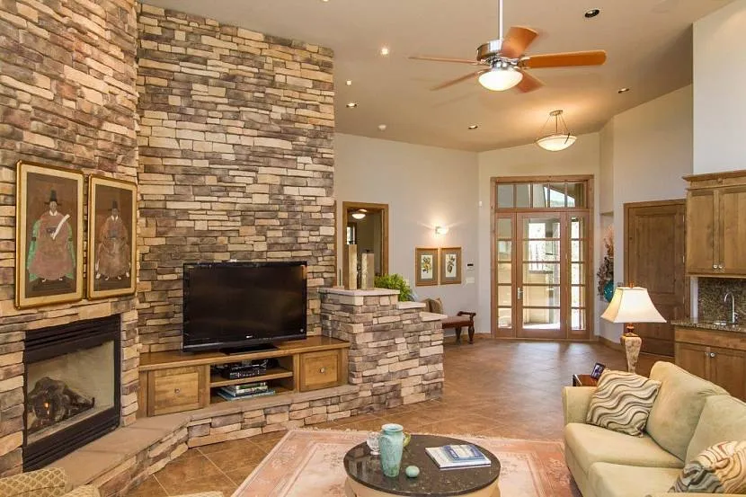 Стильно украсить интерьер гостиной можно при помощи отделки одной стены искусственным камнем
