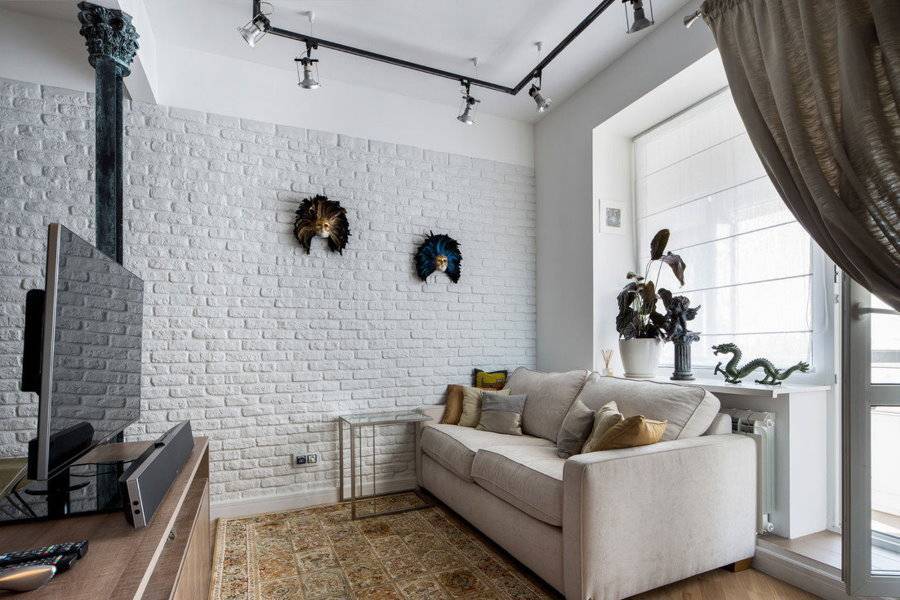 Флизелиновые обои под белый кирпич в интерьере гостиной