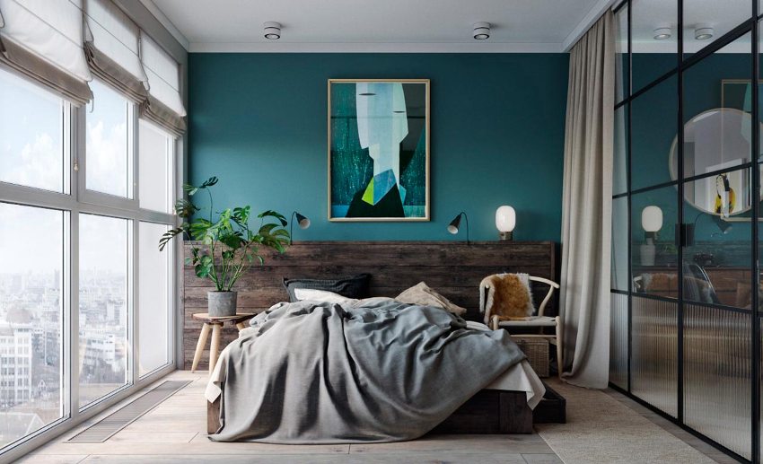 Если помещение находится с северной стороны, лучше оформить его ярко-синим, или оттенком морской волны — это сделает атмосферу в комнате более теплой. Для спальни, расположенной с южной стороны, можно подобрать более темный синий цвет.