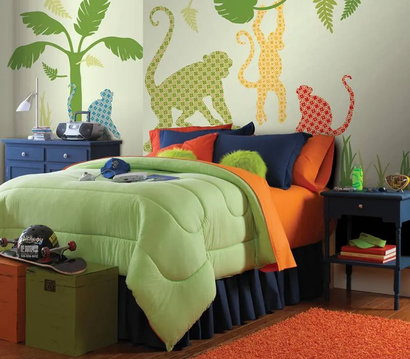 Попробуйте подобрать жизнерадостную палитру, подходящую как для мальчишеского, так и для девчоночьего темперамента. Это может быть желтый, оранжевый, зеленый и бежевый;