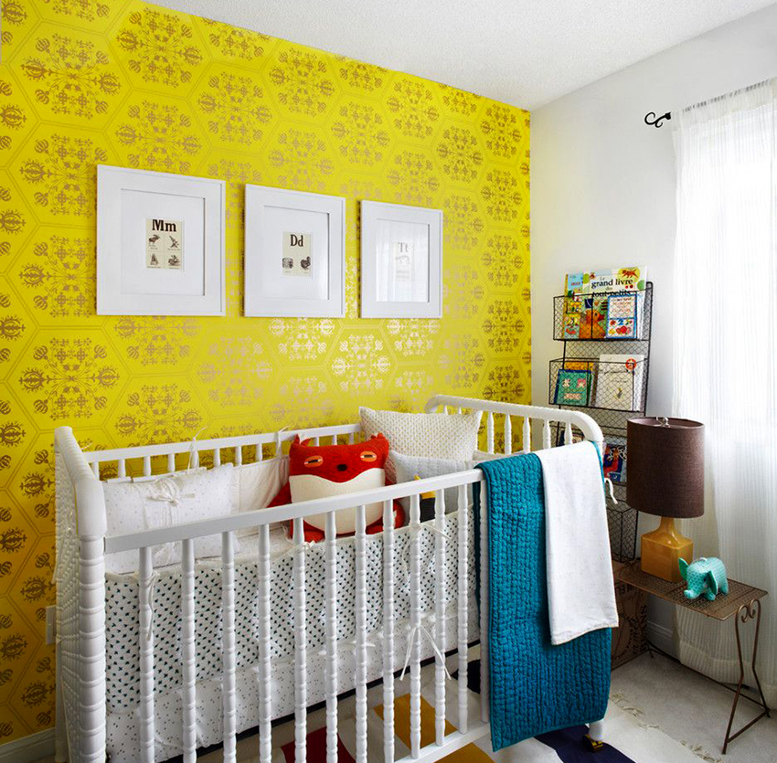 Желтые и оранжевые акценты на стенах привлекут внимание спокойных малышей. Не стоит делать всю комнату в ультра ярких цветах, можно выделить для этого отдельные зоны в пространстве или разнообразить бледные обои парой выделяющихся картинок.