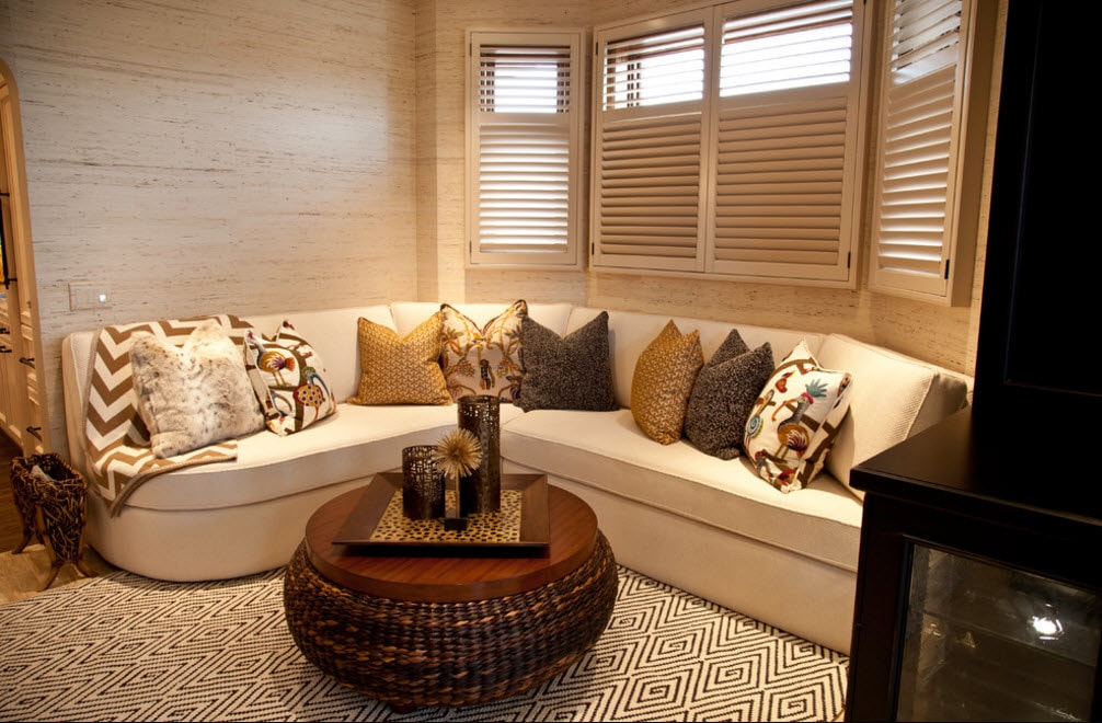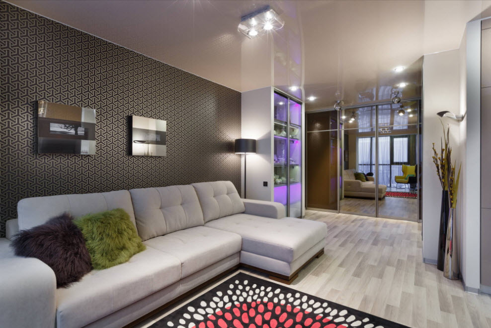 Безусловно запрет на яркие выразительные узоры не возлагается, но нужно понимать, что в компактной гостиной с ними следует действовать очень осторожно. Такого рода принты используйте дозировано, комбинируя с другими поверхностями