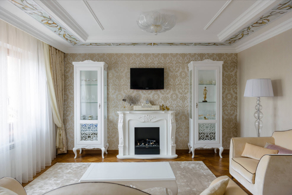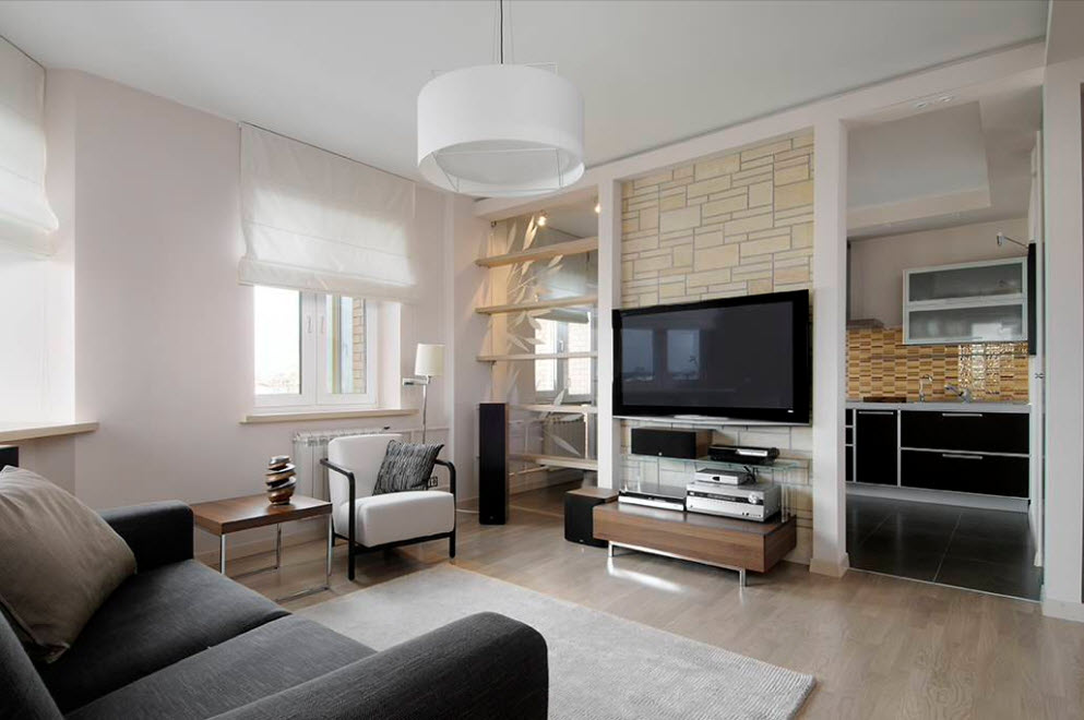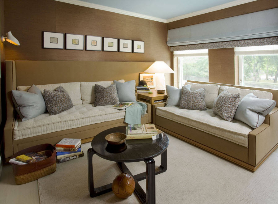 Просмотрев фотографии готовых интерьеров, можно выбрать подходящий вариант. Также стоит учесть площадь комнаты и высоту потолка. Светлые тона стен – хорошее решение для маленького плохо совещенного зала, поскольку они визуально расширяют пространство.