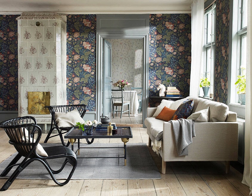 Маленькие цветки способны визуально расширить комнату, поэтому их нередко используют для отделки хрущевок. Классические интерьеры тяготеют к использованию небольших флористических мотивов, которые ритмично покрывают всю поверхность полотна.