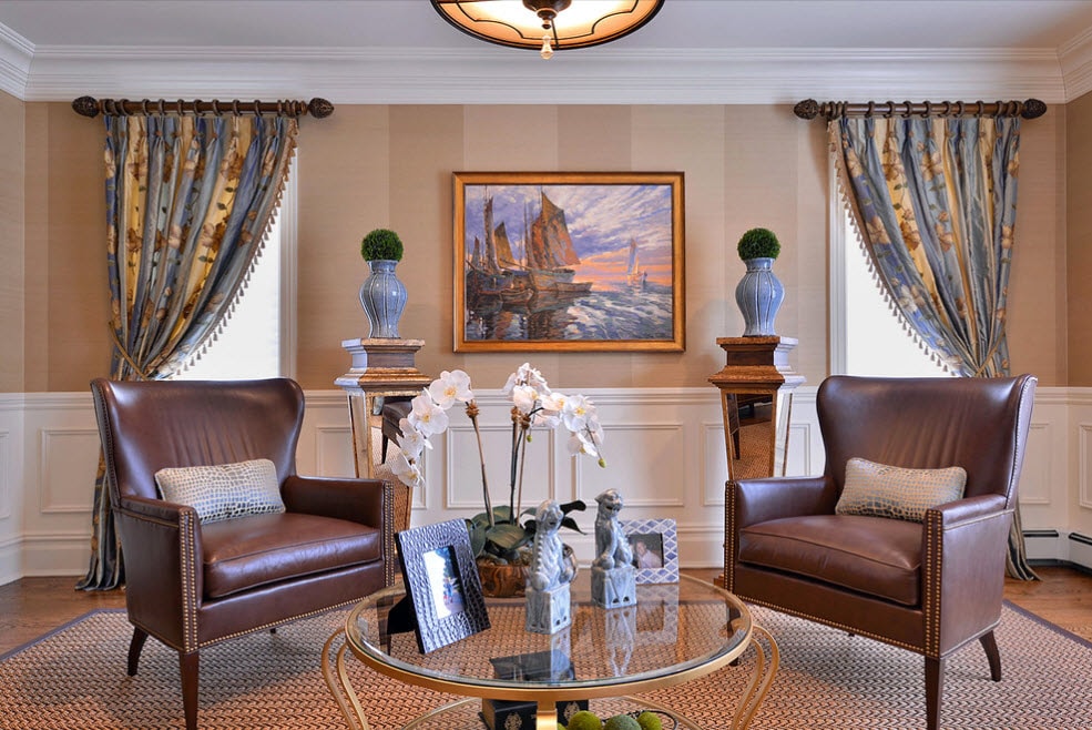 Современные производители специально выпускают коллекции с обоями-компаньонами. Нет необходимости ломать голову над подбором принтов и оттенков, а можно воспользоваться готовым предложением. Обычно комбинируют однотонные полотна и полотна с рисунком. Вот какие интересные варианты сочетания обоев двух цветов в гостиной могут получиться, фото: