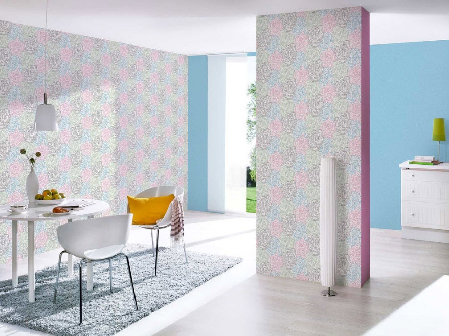 Создать неповторимый стиль поможет соединение разных типов текстур и оттенков. От правильно подобранной цветовой гаммы зависит органичность комнаты. Сочетания обоев позволяют разделить даже небольшое помещение на зону для обеда, игр и отдыха.