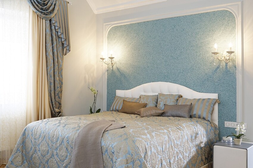- голубой цвет отличается успокаивающим эффектом, подходит для небольших спален;