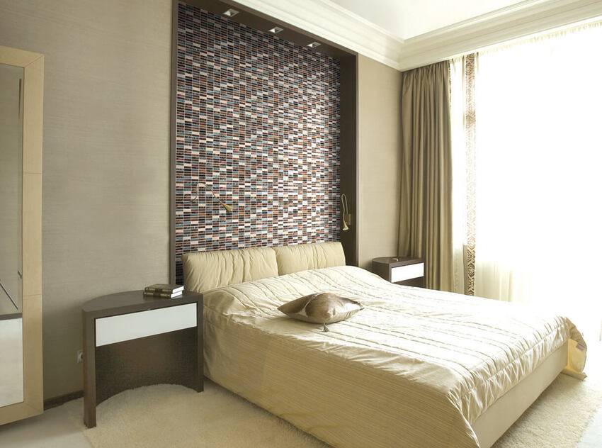 Таким образом обычно выделяют изголовье кровати, но часто это сопряжено с работами связанными с формированием, каких то эстетических элементов, выполняемых из гипсокартона: различные ниши, разноуровневые потолки и др