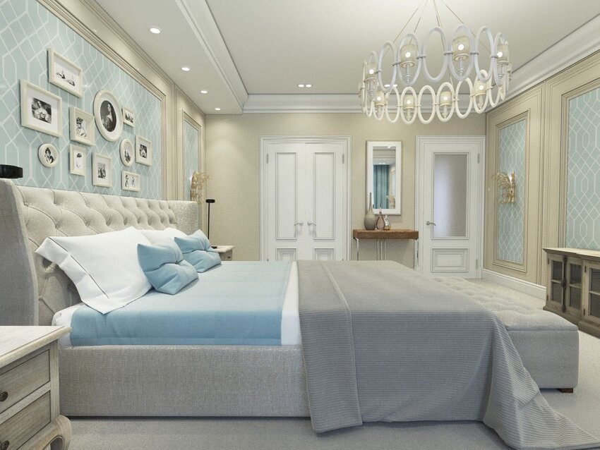 Большинство дизайнерских обоев в спальню выполнены в спокойных, нейтральных оттенках, способствующих расслаблению. К ним относят небесные тона голубого, приглушенный синий, мятный, бирюзовый цвета.