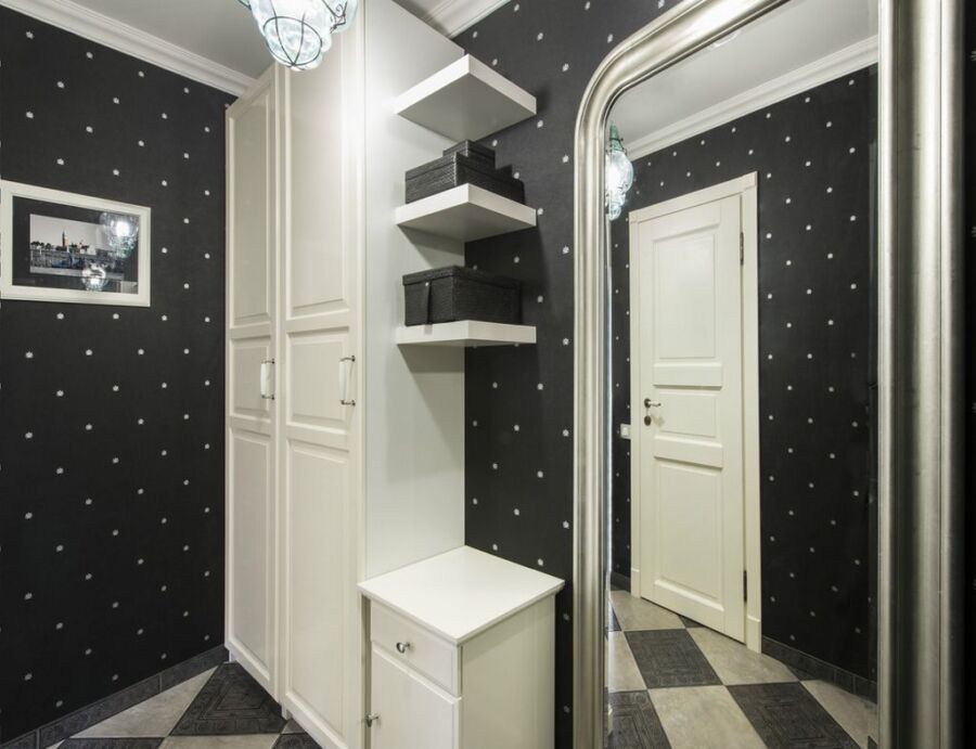 Точка фокуса – помогает скрыть дефекты пространства и материалов, оттягивая взгляд человека. К примеру, светлая дверь контрастирует на темных обоях. Чтобы нивелировать эффект используют вставки (зеркала, мебель, картины). Таким образом, светлые двери в прихожей на фоне темных обоев выглядят не кричаще.