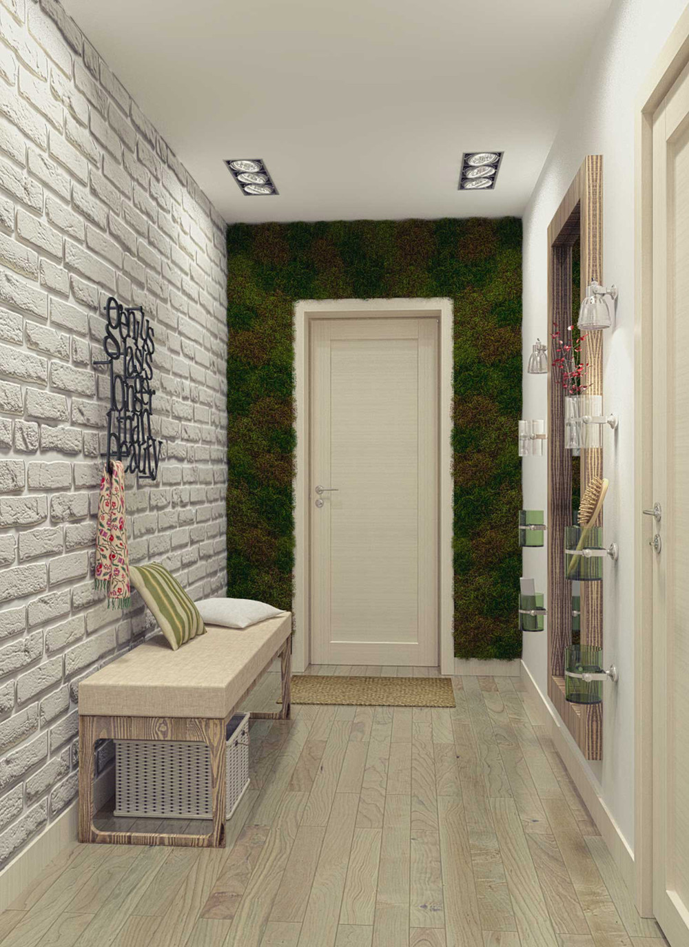 Имитация штукатурки, кирпича, дерева, камня, кожи и других материалов – удачный вариант для оформления одной или нескольких стен в интерьере прихожей.