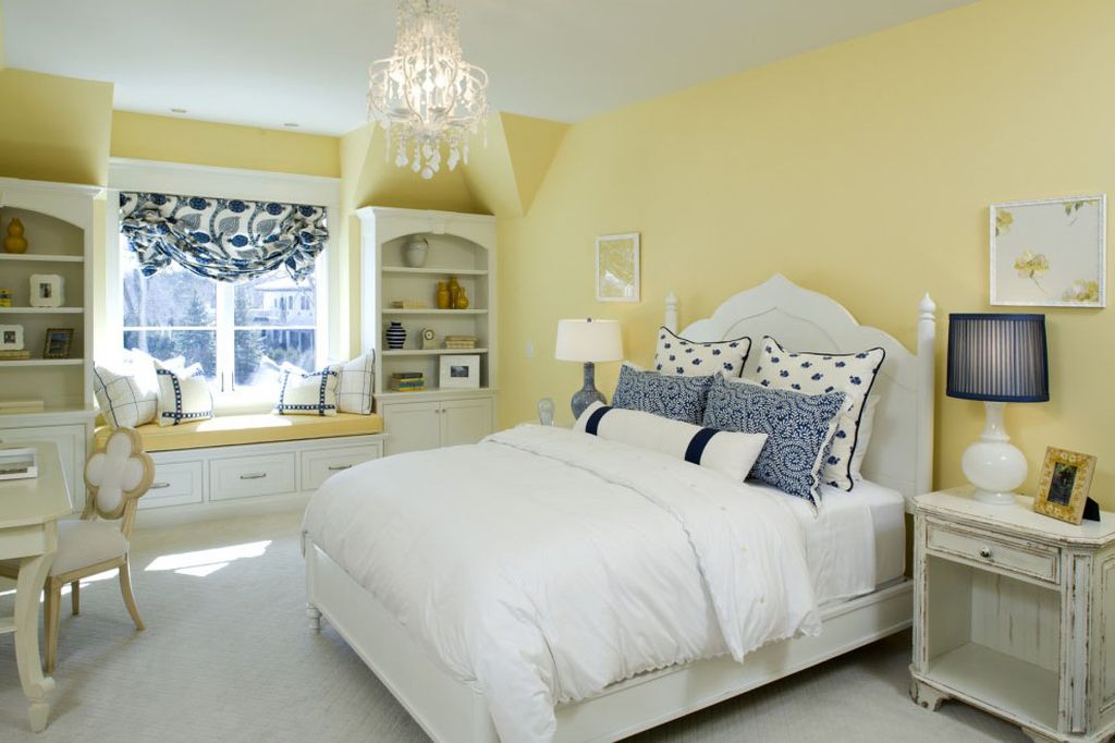 Спальни в загородных домах могут иметь различную площадь. В маленьких помещениях можно использовать белую мебель с фасадами под дерево, бежевый, светло-розовый, желтый текстиль