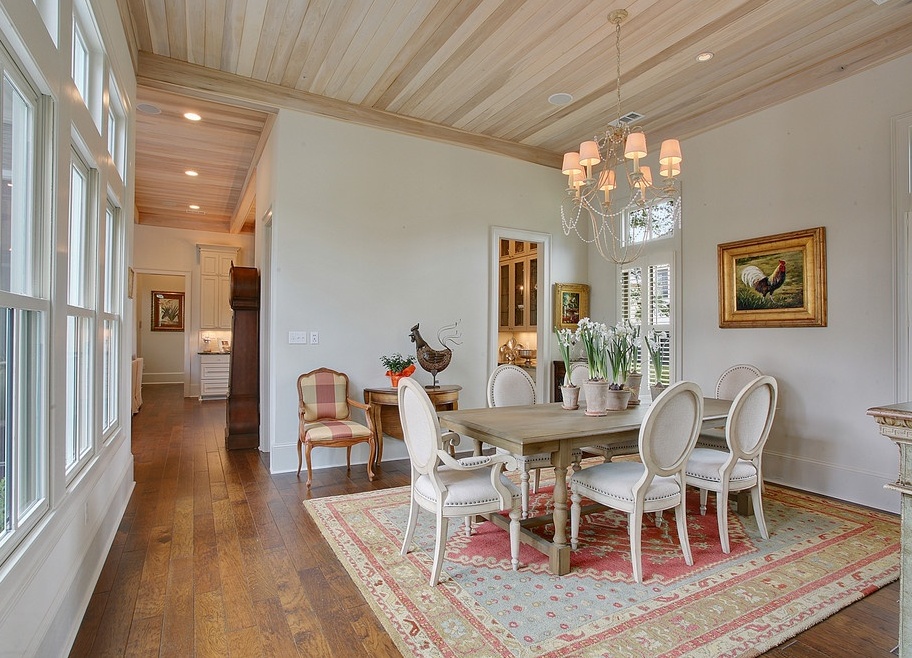 На фото столовая с потолком, отделанным вагонкой из липы.