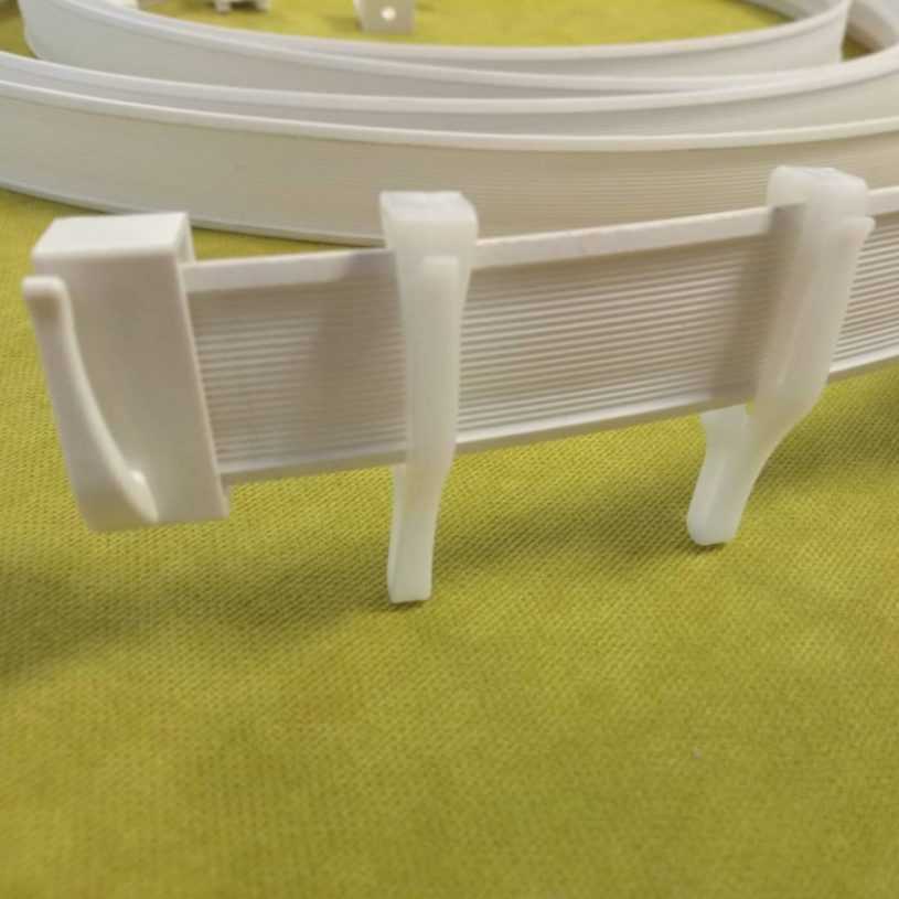 - Шина карнизная снабжена специальными желобками для крючков, которые служат держателями для штор и пластмассовыми заглушками, которые фиксируют и ограничивают скольжение.