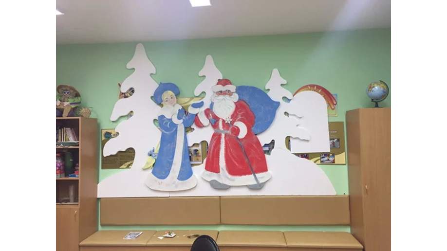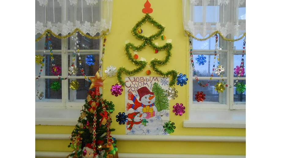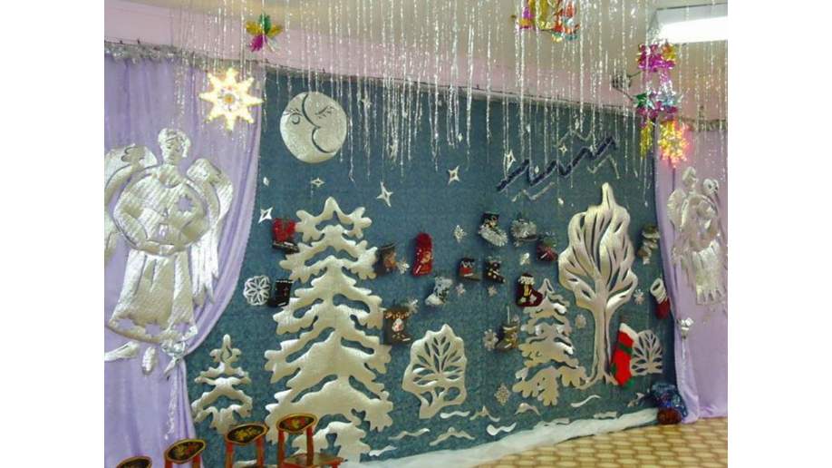 Висячие украшения, снежинки и гирлянды можно изготовить из ваты, ткани, цветных нитей и лент. На стене можно разместить декоративную елку, плакат или газету. Интересные идеи предлагают стилисты для оформления стен — объемные фигурки и символы праздника.